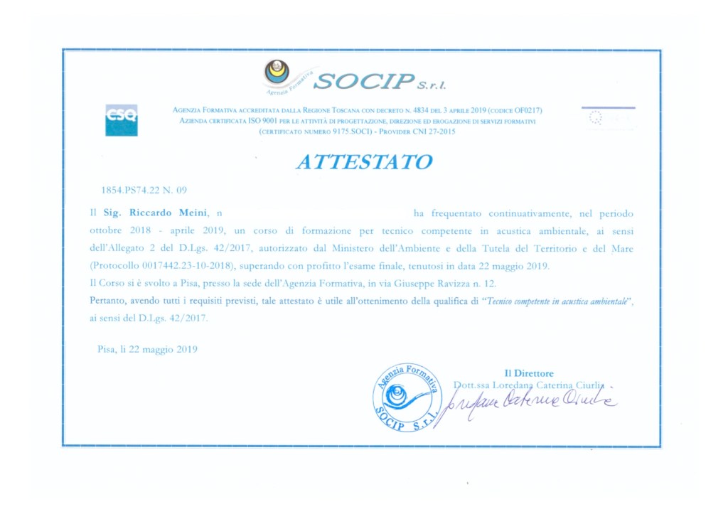 Tecnico Competente in Acustica Ambientale ai sensi del D.Lgs. 42/2017 iscritto all’elenco nazionale dei tecnici competenti in acustica al n. 10848